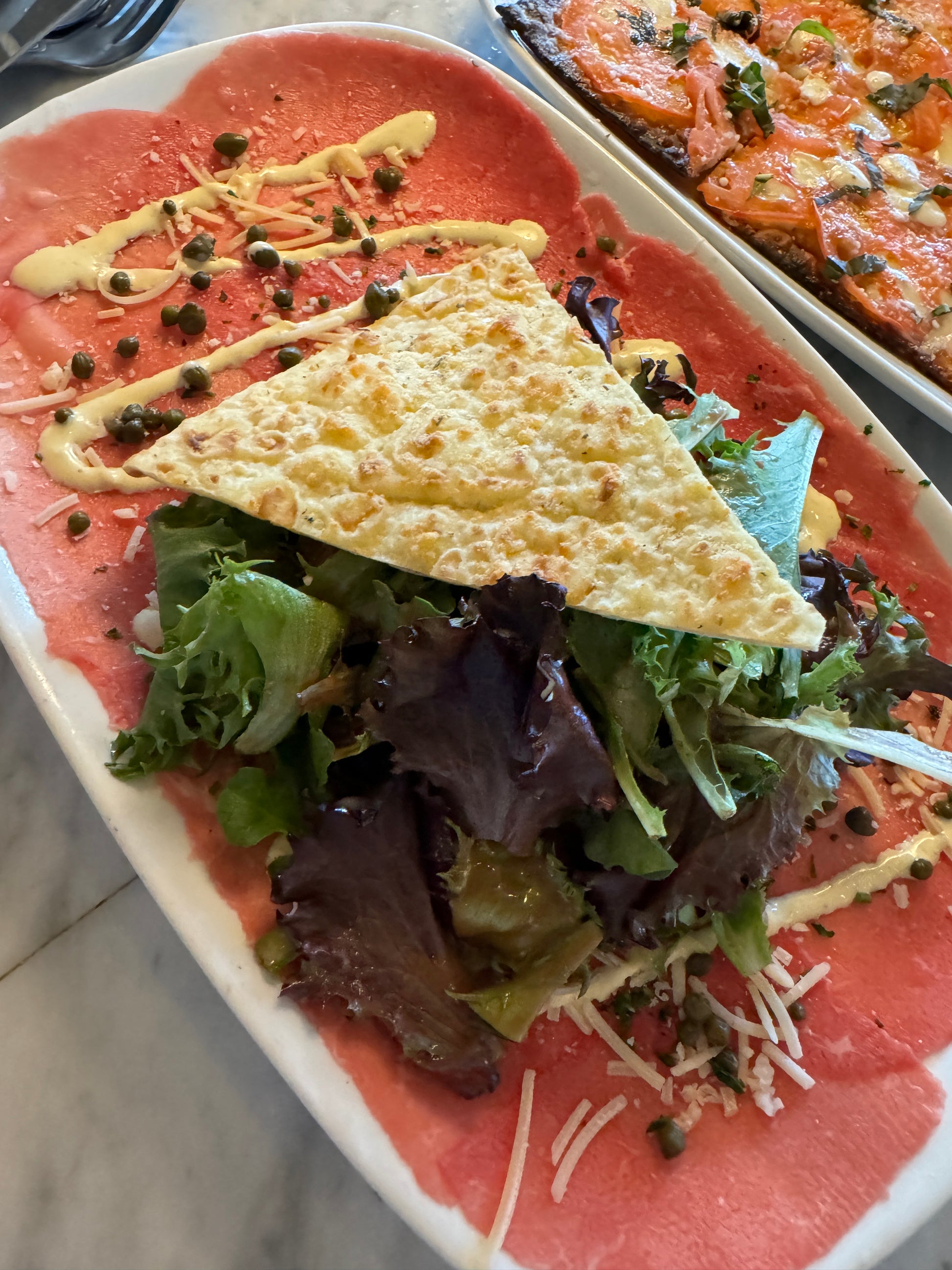 This abstract image reimagines a bountiful plate of beef carpaccio into a dynamic visual symphony of flowing shapes and vibrant colors. Deep, rich reds dominate the composition, evoking the delicate slices of beef, while creamy whites and golden yellows suggest velvety swirls of garlic aioli. Bright splashes of green bring the fresh, briny essence of capers and greens to life, creating a vivid contrast against the warm tones. Flowing curves and layered textures mimic the delicate arrangement of the dish, adding depth and movement. The harmonious interplay of bold colors and organic shapes celebrates the elegance and flavor of this classic culinary delight, turning it into an electrifying feast for the eyes. - Carpaccio, Brio Restaurant, Freehold NJ