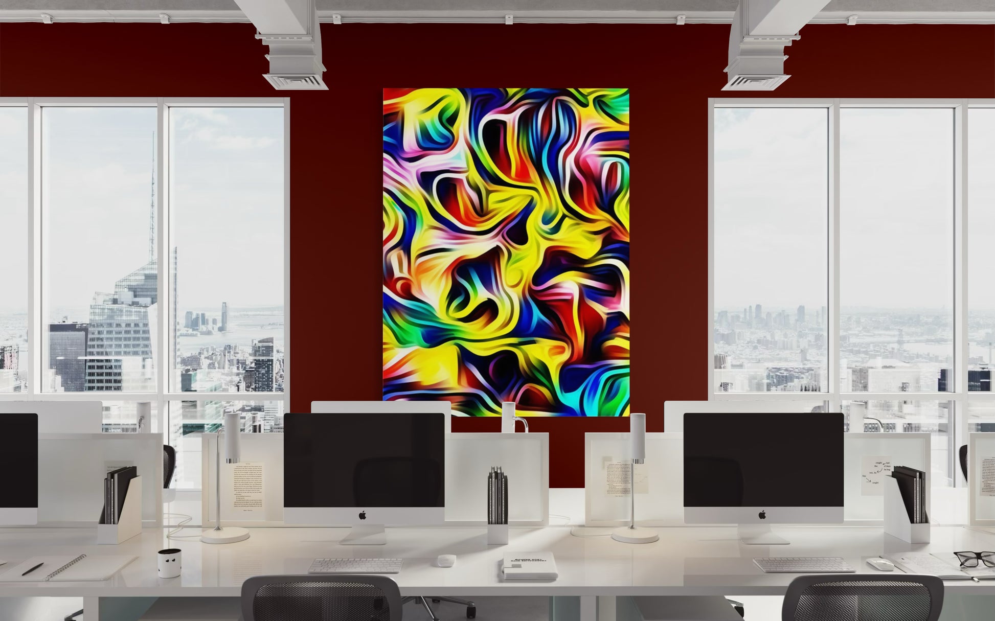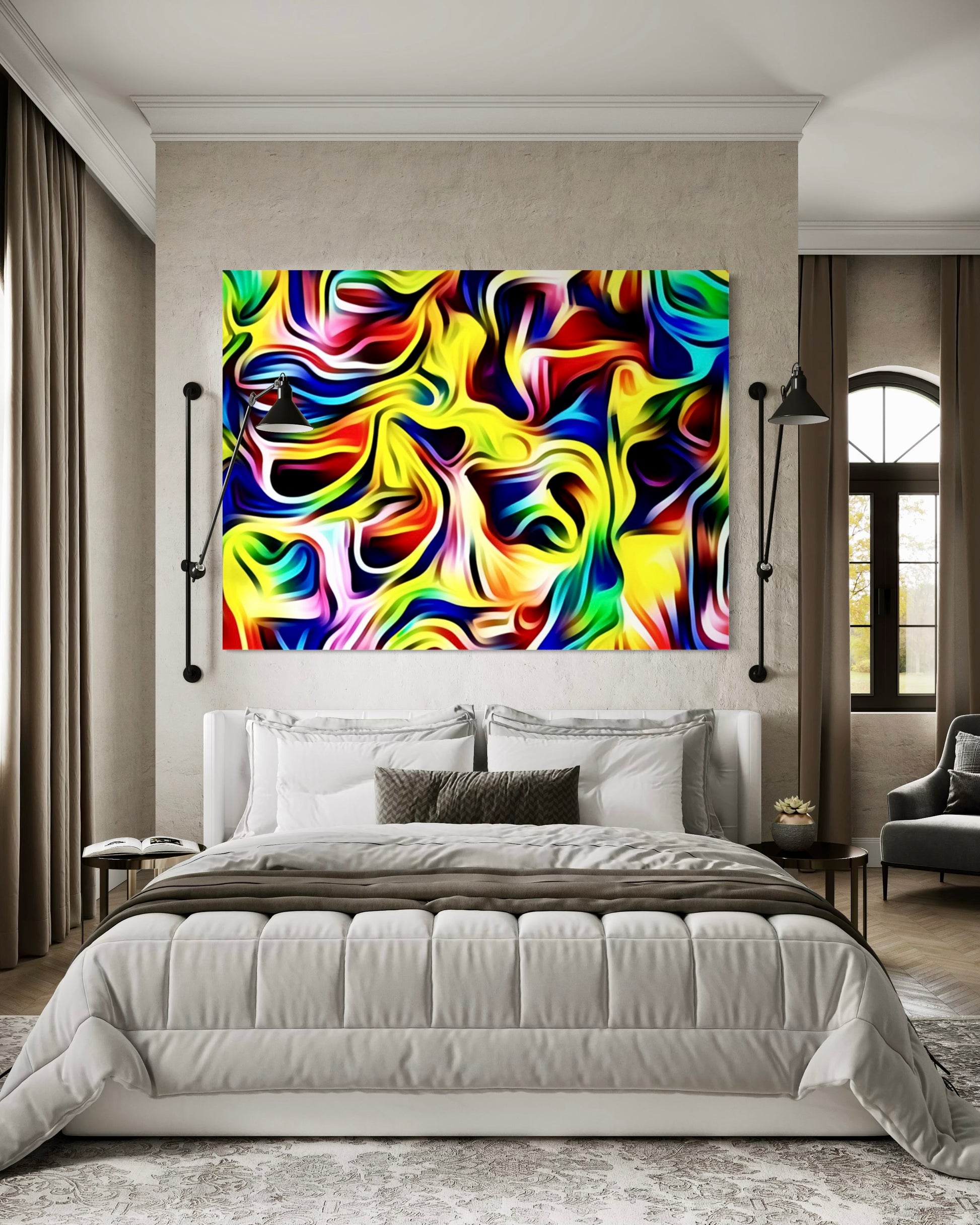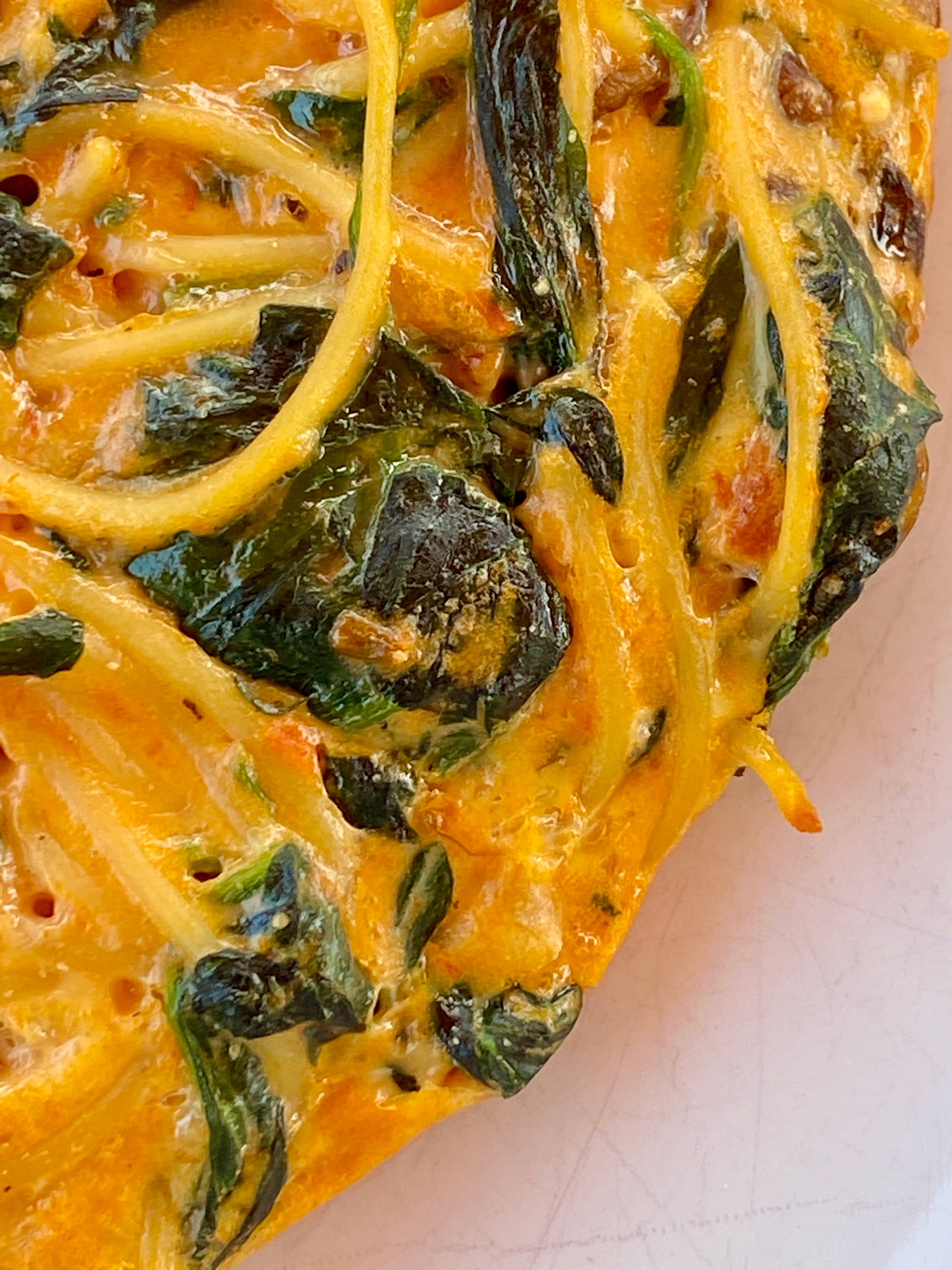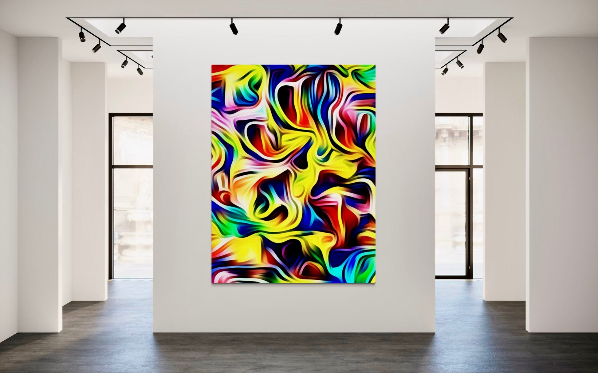 This abstract image, part of my original Eggz series, reimagines a frittata made with spinach, mushrooms, and spaghetti as a vibrant, dynamic artwork brimming with energy and motion. Swirling, fluid shapes in bright yellows, reds, blues, and greens flow like streams of liquid light, while earthy tones and bursts of green hint at the fresh vibrancy of spinach and the textures of mushrooms. The golden hues evoke the richness of eggs, and the tangled, curving forms suggest the interplay of spaghetti and other ingredients coming together harmoniously. Depth and luminosity bring the piece to life, transforming the humble frittata into a kaleidoscopic celebration of flavor, texture, and creativity, blurring the lines between food and art. - Spinach, Mushroom and Spaghetti Frittata, Homemade