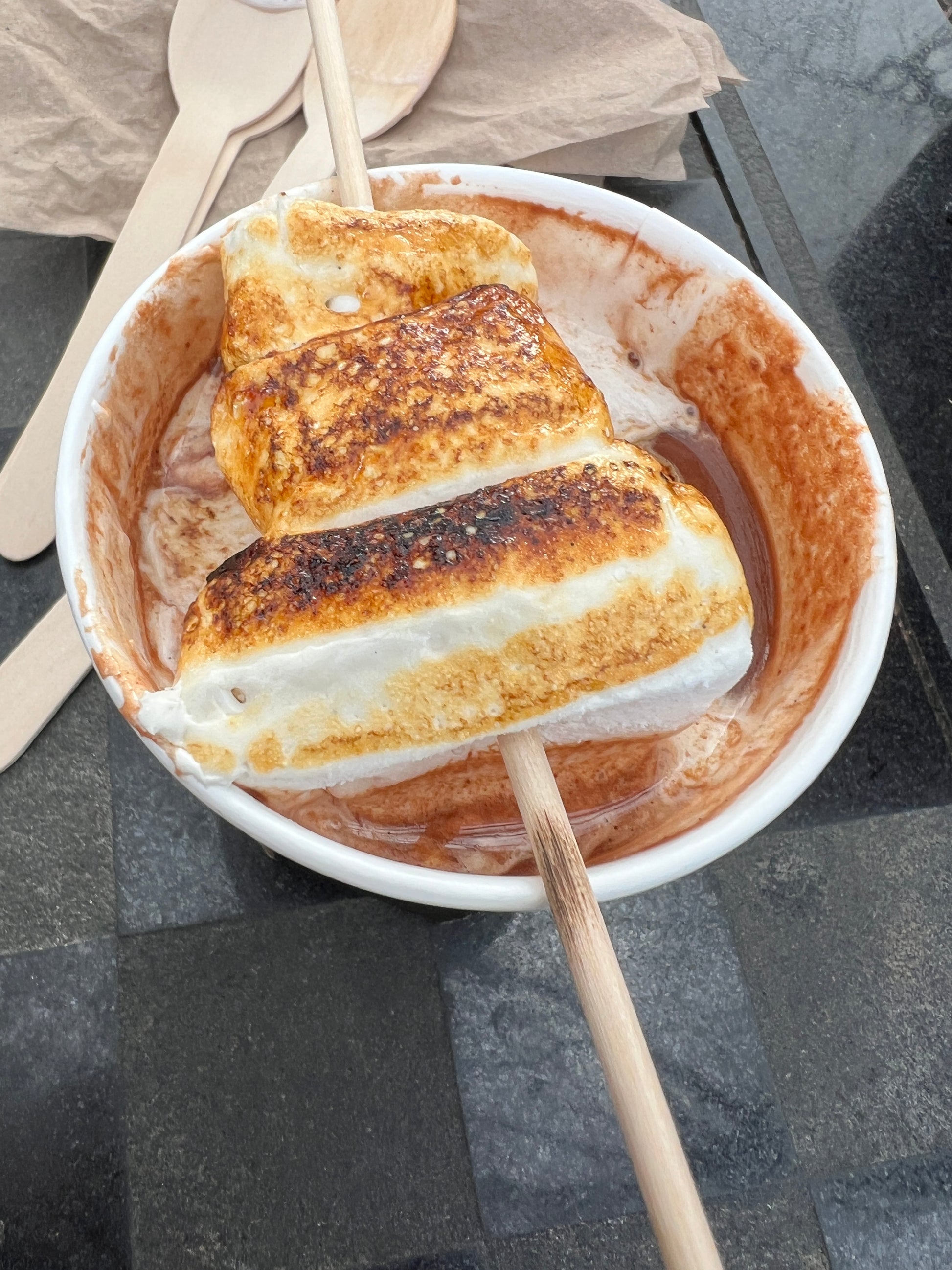 This image presents a vividly colored abstract design featuring fluid, swirling shapes that intertwine and overlap in a kaleidoscope of bright hues - yellows, blues, reds, greens, purples, and oranges. These are accentuated with bold black outlines that enhance their visual separation and contribute to the image's overall sense of movement. It’s as if the colors are dancing or melting into each other, like a fantastical river of hot, melted chocolate, but with an imaginative twist. The creamy cocoa imbued with a spectrum of vibrant colors, flowing and swirling in a mesmerizing pattern. Or maybe I’m just reaching here. Suggesting a river of chocolate à la Willy Wonka because this is, in fact, an image of chocolate. When the weather turns cold we always yearn for a cup of this ridiculously indulgent chocolate elixir - reinterpreted into what you see here. - Habanero Hot Chocolate, The Bent Spoon, Princeton NJ