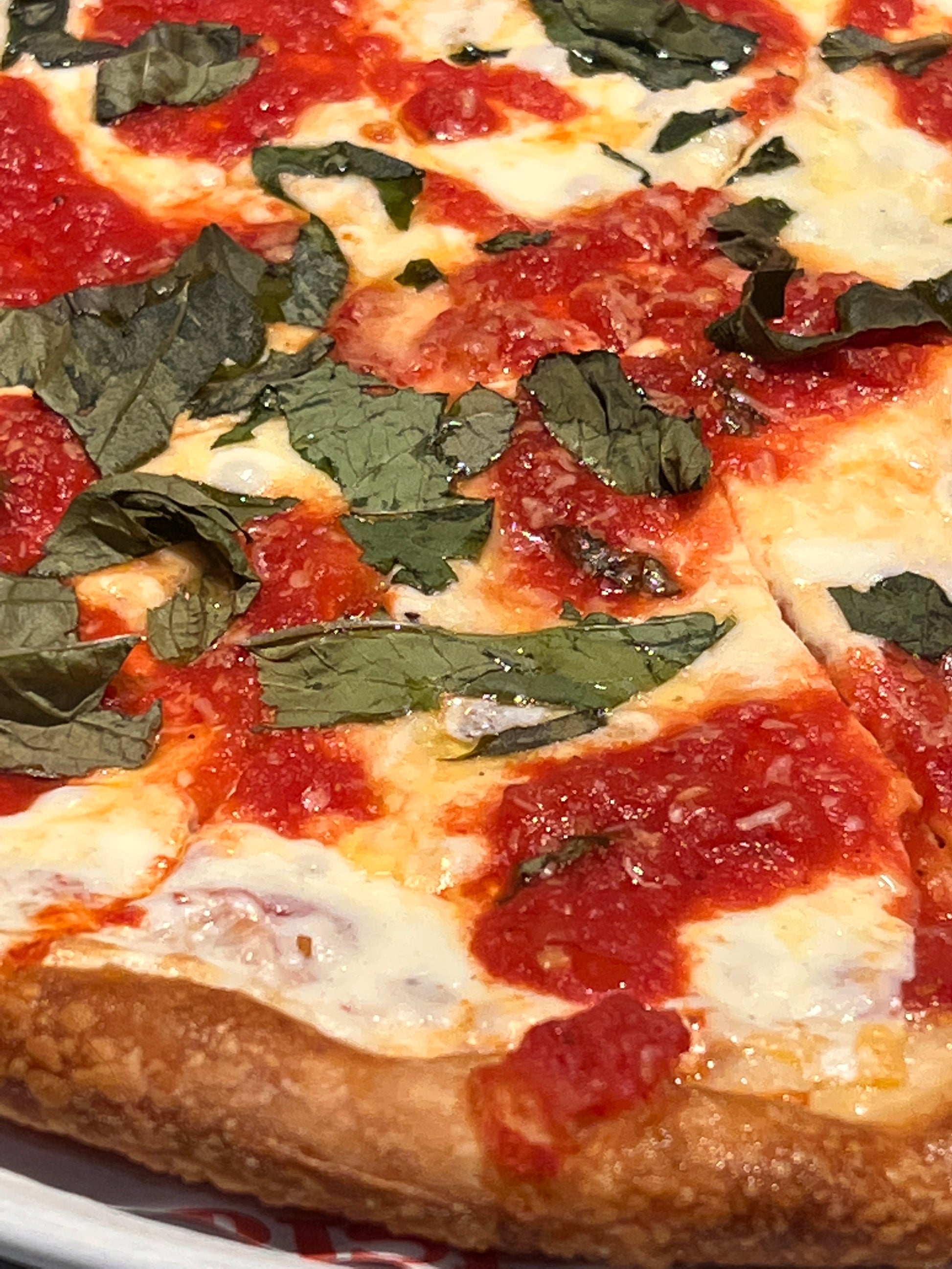 The swirls and flows of color in this image capture the essence of a Margherita pizza in abstract form. Bold reds and deeper maroon hues swirl together, evoking the rich, tangy tomato sauce base. Patches of creamy white, reminiscent of soft, melted mozzarella dot the image in generous pools. Verdant greens twist into the palette, like fresh basil leaves that add their aromatic fragrance and bright flavor. The occasional blue and purple tones hint at the smoky char of the crust, freshly crisped in a wood-fired oven. This image is a celebration of the classic Italian flavors of a Margherita pizza, represented in a lively dance of colors that are as vibrant and inviting as the dish itself. My son’s favorite. Made at home, on family pizza night. - Margherita Pizza, Homemade